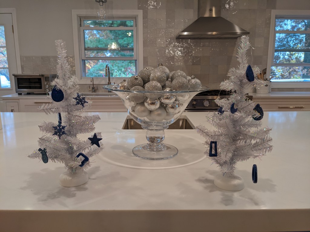Sienna decorated tiny trees with all navy glitter for a chic look on our new island. See link for more ornaments and festive jewelry