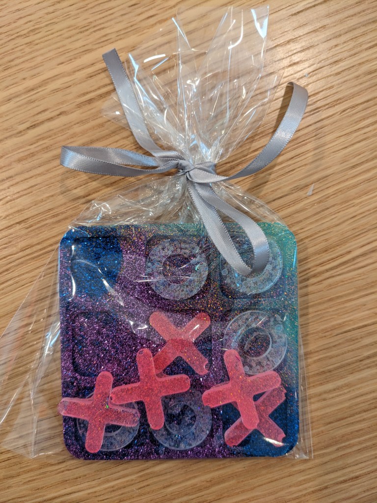 These are just breathtakingly beautiful featuring a glittering molded board and 10 game pieces, 5 of each type. Who doesn’t love a break from screens to play tic tac toe?! Game pieces range from X’s and O’s to sea creatures to ice cream to gummy bears! (These are in limited quantities because they go out the door faster than she can create them! She is working hard to stock up for the fair but exact items may vary from this picture!)